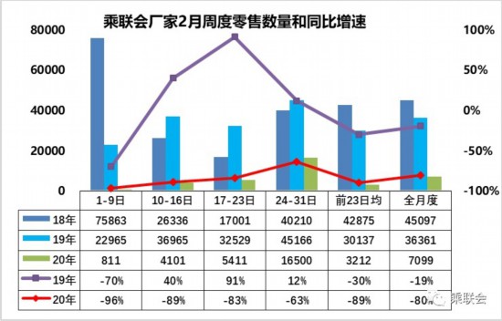 乘聯(lián)會(huì)指出,2月第一周的乘用車市場零售處于冰封狀態(tài),日均零售811輛,同比增速下降96%,銷量總體偏低。第二周的零售達(dá)到日均4100輛,同比增速下降89%,2月前兩周的零售同比下滑92%,零售市場回暖較慢。第三周的零售達(dá)到日均5411輛,同比增速下降83%,第三周環(huán)比第二周零售增長32%。第四周的零售達(dá)到日均1.6萬輛,同比增速下降63%。
