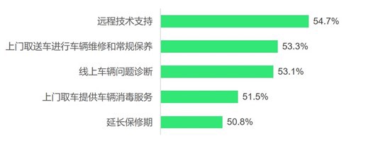 特殊時(shí)期,車主希望汽車品牌和經(jīng)銷商提供遠(yuǎn)程技術(shù)支持(54.7%)和線上車輛問(wèn)題診斷服務(wù)(53.1%),以盡量減少進(jìn)店頻次。線上服務(wù)需求對(duì)廠商的數(shù)字化能力提出了更高的要求。此外,五成車主希望經(jīng)銷商提供上門(mén)取送車保養(yǎng)或消毒服務(wù),經(jīng)銷商應(yīng)把握上門(mén)服務(wù)機(jī)會(huì),創(chuàng)造新的服務(wù)需求。