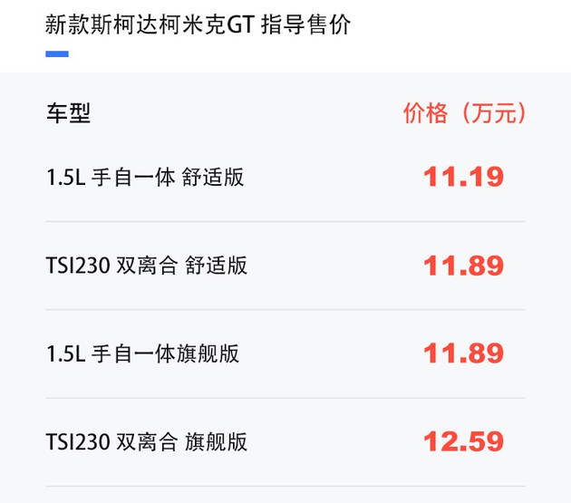 日前,我們從官方獲悉,新款斯柯達柯米克GT正式上市,新車共推出4款車型,價格區(qū)間11.19-12.59萬元。新車油箱容積與老款車型相比有所變化,全系均更換為52.8L油箱。