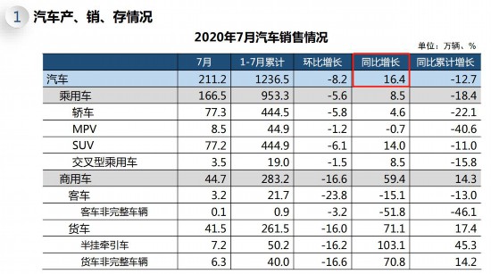 人民網(wǎng)北京8月11日電(王紫)8月11日,據(jù)中國汽車工業(yè)協(xié)會(huì)發(fā)布月度數(shù)據(jù)顯示,7月我國汽車產(chǎn)銷形勢總體穩(wěn)定,銷量達(dá)211.2萬輛,同比增長16.4%,其中商用車同比增速明顯。