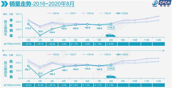 8月,國內(nèi)狹義乘用車銷量達(dá)到170.3萬輛,同比增長8.9%,增速相比上月再度提升。自8月中旬起,大型展會陸續(xù)開展,以及全面的第三產(chǎn)業(yè)恢復(fù),為市場帶來了更強(qiáng)的消費信心和“消費內(nèi)循環(huán)”動力,進(jìn)而促使行業(yè)整體呈現(xiàn)出快速回暖態(tài)勢。