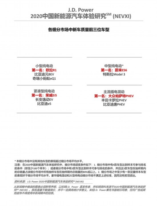 研究結(jié)果顯示,上汽大眾(105 個(gè) PP100)獲得插電混動(dòng)車市場(chǎng)新車質(zhì)量第一名,寶馬(108個(gè)PP100)位列插電混動(dòng)車市場(chǎng)第二位。蔚來(109 個(gè) PP100)獲得純電動(dòng)車市場(chǎng)新車質(zhì)量第一名,特斯拉(113個(gè)PP100)和歐拉(129個(gè)PP100)位列純電動(dòng)車市場(chǎng)第二和第三位;車型層面,歐拉R1榮獲小型純電動(dòng)細(xì)分市場(chǎng)第一;榮威Ei5榮獲緊湊型純電動(dòng)細(xì)分市場(chǎng)第一;蔚來ES6摘得中型純電動(dòng)細(xì)分市場(chǎng)第一;大眾帕薩特 PHEV 摘得主流插電混動(dòng)細(xì)分市場(chǎng)第一;豪華插電混動(dòng)和大型純電動(dòng)細(xì)分市場(chǎng)因?yàn)椴粷M足細(xì)分市場(chǎng)頒獎(jiǎng)條件,因而沒有獎(jiǎng)項(xiàng)頒出。
