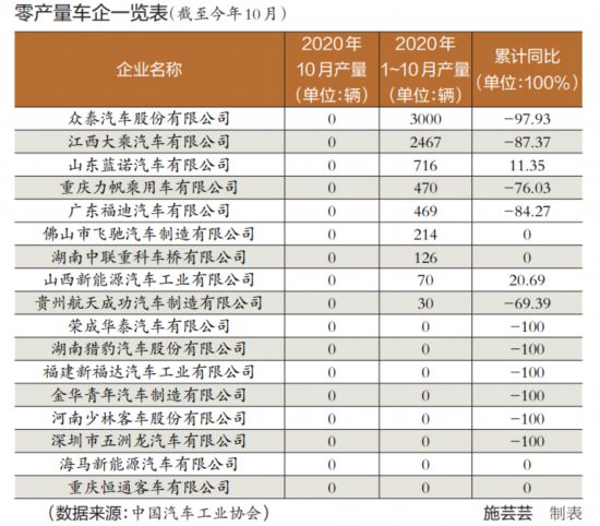 正如蔡榮華所言,我國(guó)汽車產(chǎn)銷量占全球30%左右,企業(yè)競(jìng)爭(zhēng)日趨激烈,但是盲目投資、產(chǎn)能利用率比較低的問(wèn)題尚未得到有效解決?!吨袊?guó)汽車工業(yè)產(chǎn)銷快訊》(2020年第11期)數(shù)據(jù)顯示,在總共被統(tǒng)計(jì)的88家汽車企業(yè)中,今年10月汽車產(chǎn)量為零的汽車企業(yè)竟然多達(dá)17家(事實(shí)上,這一數(shù)據(jù)在8月為16家),今年前10個(gè)月產(chǎn)量低于500輛的共有25家,其中,有8家生產(chǎn)企業(yè)今年未生產(chǎn)過(guò)1輛汽車,占比接近一成。