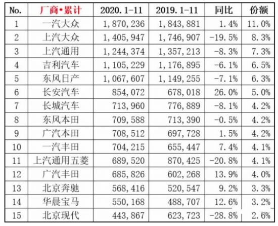 整體來看,穩(wěn)坐銷量前三名的“南北大眾”和上汽通用已提前鎖定年度三強,但上汽大眾今年以來跌幅“慘重”,相比去年1-11月,少賣了超34萬輛。相比之下,自主品牌和日系車企表現(xiàn)亮眼。