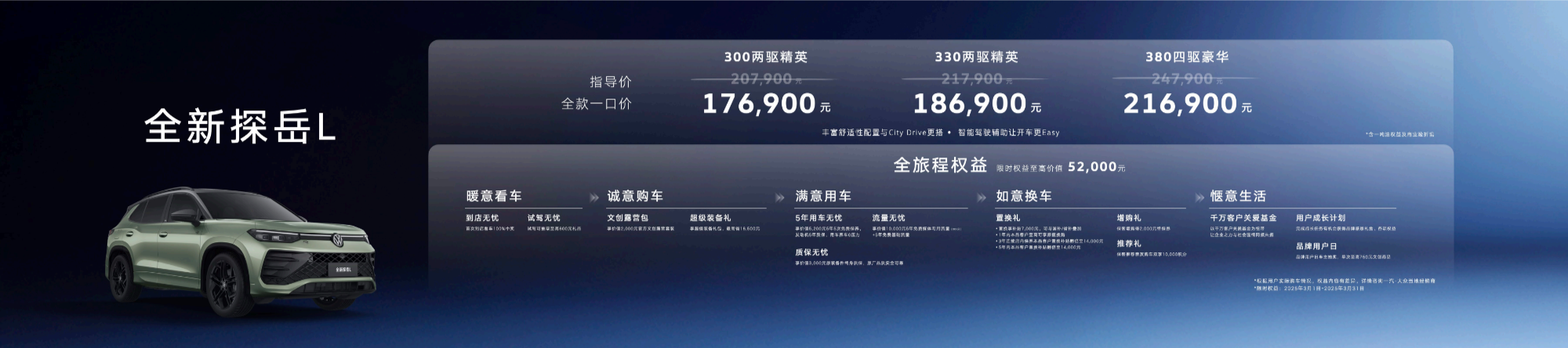 3月1日,一汽-大眾全新探岳L在五岳之首泰山震撼上市,新車共推出300TSI、330TSI、380TSI三種動力配置共3種車型,官方指導(dǎo)價20.79萬元起,可選裝舒適性配置豐富的City包和駕駛輔助功能Easy包?,F(xiàn)在購買全新探岳L,還將享受17.69萬元起的全款一口價。