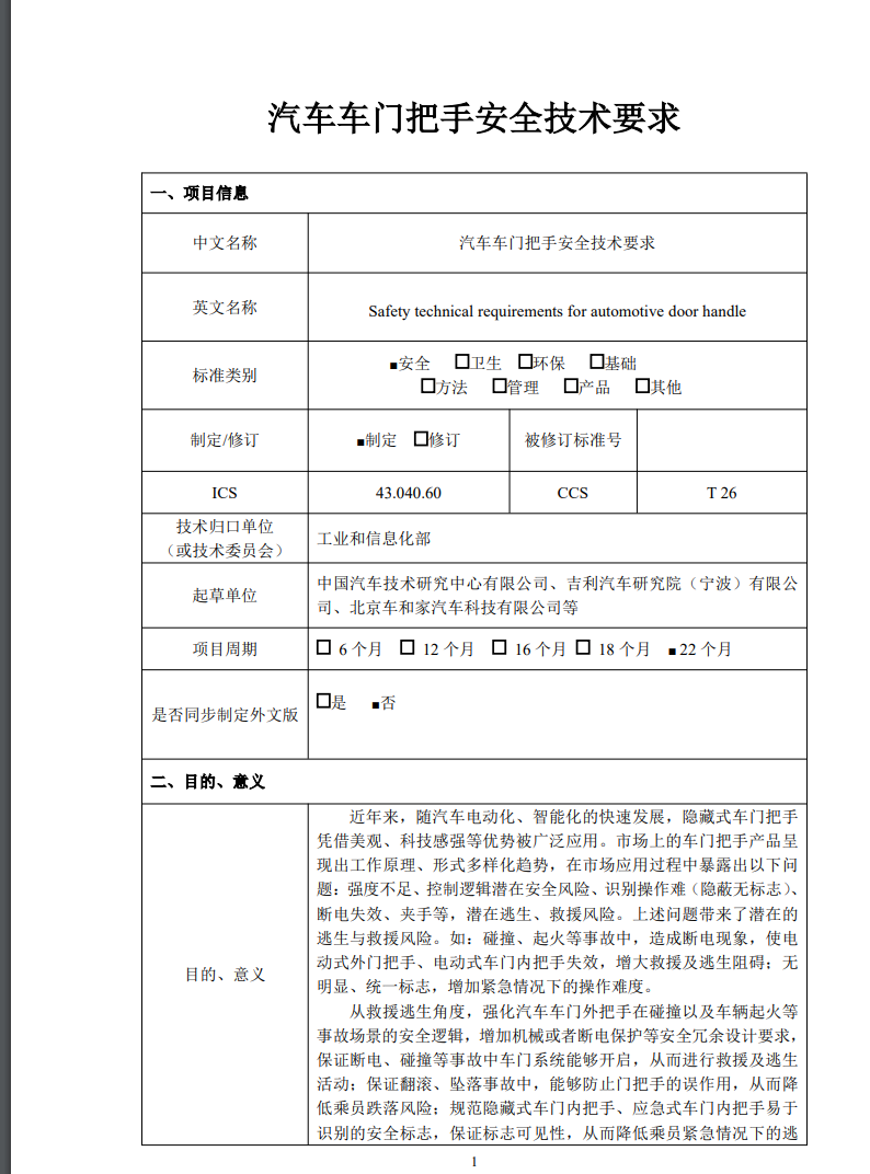 該文件中稱,近年來,隨汽車電動化、智能化的快速發(fā)展,隱藏式車門把手憑借美觀、科技感強等優(yōu)勢被廣泛應用。市場上的車門把手產品呈現出工作原理、形式多樣化趨勢,在市場應用過程中暴露出以下問題:強度不足、控制邏輯潛在安全風險、識別操作難(隱蔽無標志)、斷電失效、夾手等,潛在逃生、救援風險。上述問題帶來了潛在的逃生與救援風險。如:碰撞、起火等事故中,造成斷電現象,使電動式外門把手、電動式車門內把手失效,增大救援及逃生阻礙;無明顯、統(tǒng)一標志,增加緊急情況下的操作難度。