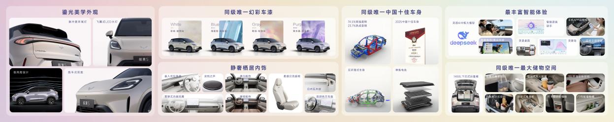 步入“舒嶼座艙”,細(xì)節(jié)皆巧思。繽果S以“靜奢棲居美學(xué)”為靈感,通過環(huán)抱式布局、貫穿式內(nèi)嵌風(fēng)幕與柔感貝殼座椅等設(shè)計(jì),營造出沉浸式的舒適氛圍。搭配同級(jí)唯一的6揚(yáng)聲器系統(tǒng)與阿嘉米斯專業(yè)聲場調(diào)校,進(jìn)一步提升了座艙的靜謐質(zhì)感與聽覺享受。12.8英寸高清大屏內(nèi)置“1+N”靈語AI中樞大模型,深度融合DeepSeek大模型,以更全面的壁紙玩法、八大區(qū)域的方言溝通、更多的智能場景應(yīng)用,為用戶帶來真正“更懂你的”智能座艙體驗(yàn)。