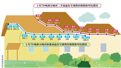 新房銷售價格環(huán)比上漲的有50城,比3月多12個;二手房銷售價格環(huán)比上漲的有37個,比3月多5個