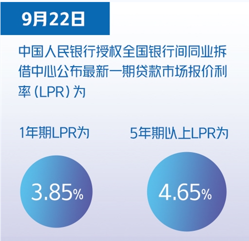 9月22日,中國人民銀行授權(quán)全國銀行間同業(yè)拆借中心公布最新一期貸款市場報(bào)價(jià)利率(LPR)為:1年期LPR為3.85%,5年期以上LPR為4.65%。兩項(xiàng)貸款市場報(bào)價(jià)利率均連續(xù)18個(gè)月保持這一水平。