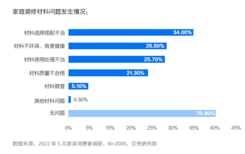 報告顯示,有超過六成的家裝消費(fèi)者曾遇到過材料問題,其中既有涉及材料本身的問題,例如材料不環(huán)保有害健康(26.5%)、材料質(zhì)量不合格(21.3%)、以及材料假冒(5.1%);也有涉及材料使用的問題,例如材料選擇搭配不當(dāng)(34%)、材料使用處理不當(dāng)(25.7%)等。