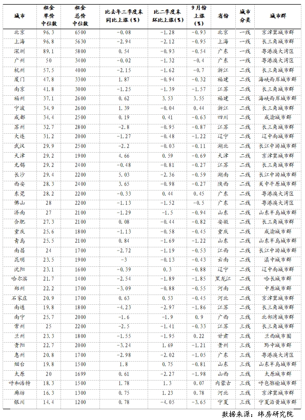 三季度全國(guó)重點(diǎn)40城三居室租金支出同比跌幅最大