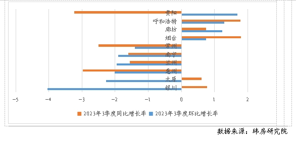 緯房研究院數(shù)據(jù)顯示,重點(diǎn)40城中,僅有10個(gè)城市住房租金環(huán)比上升,其余30個(gè)城市住房租金均環(huán)比下降。其中,租金上漲的城市增幅也并不可觀,環(huán)比增長(zhǎng)率大多不到1%。租金下跌的30城中,12個(gè)城市租金跌幅在1%以內(nèi),12個(gè)城市跌幅在1%-2%之間,6個(gè)城市跌幅超過(guò)2%。與2022年三季度末相比,重點(diǎn)40城中16個(gè)城市住房租金同比上漲,24個(gè)城市同比下降。其中,3個(gè)城市同比增長(zhǎng)超過(guò)2%,13個(gè)城市同比漲幅在2%以內(nèi),12個(gè)城市同比跌幅在2%以內(nèi),11個(gè)城市同比跌幅在2%-4%之間,1個(gè)城市同比跌幅超過(guò)4%。