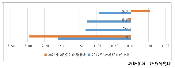 三季度,一線城市租金成交價(jià)同比跌幅高于二線城市,一線城市除北京微漲外,上海、廣州、深圳均同比下跌