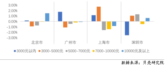 圖14 2023年三季度一線城市不同價(jià)格段占比的同比變化