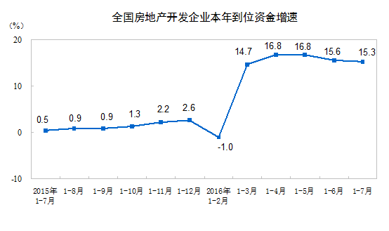 1-7月份,房地產(chǎn)開發(fā)企業(yè)到位資金79881億元,同比增長(zhǎng)15.3%,增速比1-6月份回落0.3個(gè)百分點(diǎn)。其中,國(guó)內(nèi)貸款12605億元,增長(zhǎng)0.7%;利用外資93億元,下降49.8%;自籌資金27877億元,增長(zhǎng)0.4%;其他資金39307億元,增長(zhǎng)36.3%。在其他資金中,定金及預(yù)收款22321億元,增長(zhǎng)31.6%;個(gè)人按揭貸款13305億元,增長(zhǎng)54.6%。