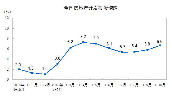 2016年1-10月份,全國房地產(chǎn)開發(fā)投資83975億元,同比名義增長6.6%,增速比1-9月份提高0.8個百分點(diǎn)。其中,住宅投資56294億元,增長5.9%,增速提高0.8個百分點(diǎn)。住宅投資占房地產(chǎn)開發(fā)投資的比重為67.0%。