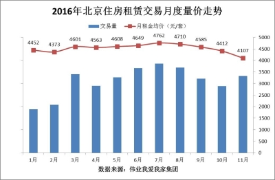 按照慣例,10月之后北京租賃市場(chǎng)進(jìn)入傳統(tǒng)淡季,剛剛過(guò)去的11月,北京月租金均價(jià)創(chuàng)年內(nèi)新低。據(jù)偉業(yè)我愛我家集團(tuán)市場(chǎng)研究院統(tǒng)計(jì),2016年11月,北京區(qū)域通過(guò)我愛我家達(dá)成的住宅租賃交易量環(huán)比10月同期上漲14.8%,但月租金均價(jià)為4107元/平米,環(huán)比10月下跌6.9%。