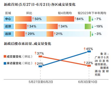 廣州“5·28”新政后,市場(chǎng)反應(yīng)確實(shí)很積極。據(jù)合富研究院監(jiān)測(cè),“5·28”新政落地,連續(xù)政策利好刺激下全市成交(基于認(rèn)購(gòu)數(shù)據(jù))階梯式上漲。5月27日至6月2日,來(lái)訪、成交環(huán)比分別上升21%、37%。各區(qū)域成交熱度均有改善,中心區(qū)域成交環(huán)比上升50%,多個(gè)熱盤(pán)如天河區(qū)越秀·觀樾,海珠區(qū)保利燕語(yǔ)堂悅、琶洲南TOD,荔灣區(qū)保利和頌等單周成交超20套。近郊、遠(yuǎn)郊成交環(huán)比分別上升34%及29%。此外,6月3日至10日,廣州樓市熱度持續(xù)活躍,來(lái)訪量比前一周上漲45%,成交量(基于認(rèn)購(gòu)規(guī)模統(tǒng)計(jì))環(huán)比上升22%;近郊黃埔、番禺來(lái)訪人氣環(huán)比均有不同程度上升,成交量比前一周上漲27%。