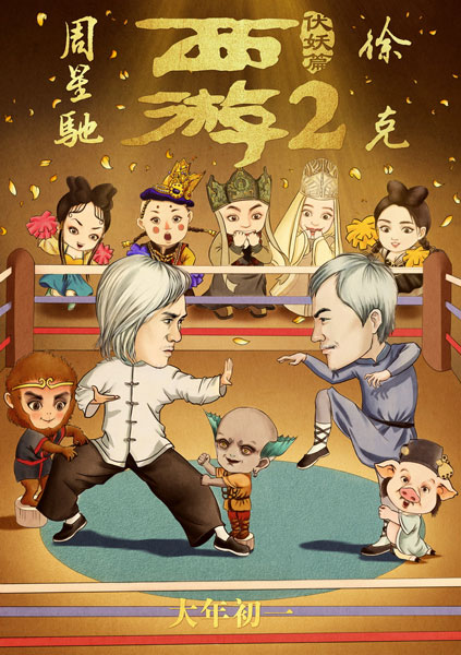 此外,隨預(yù)告片一同發(fā)布的“對壘版”漫畫海報也非常逗趣:周星馳與徐克兩人化身武林高手的漫畫形象在擂臺上展開對壘。周星馳太極拳的姿勢與影片《功夫》中阿星的形象極為相似,徐克的招式動作也很有黃飛鴻的架勢。而化身為Q版造型的師徒四人則為擂臺上的兩人按摩捶腿、加油助威,充滿童趣。