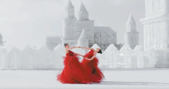 2021年,某時(shí)尚品牌的一則創(chuàng)意視頻《開放空間》火遍網(wǎng)絡(luò)。視頻中,幾位舞者在麥田、湖泊上奔跑、飛翔、翻滾,每一位舞者如同精靈,那種逐風(fēng)的自由讓無數(shù)觀眾眼前一亮,仿佛夢境成真。2022年,舞蹈影像導(dǎo)演李翠穎創(chuàng)作的《映雪紅珊》堪為黑龍江的絕美宣傳片。作品中,兩位身著夸張紅舞裙的舞者,在肅穆的冰雪世界中緩慢起舞,當(dāng)呼吸凝成霧氣,冰封的大地如銀河一般靜寂,兩朵“紅梅”在凜冽與寂靜中開放,展現(xiàn)出中國極北之地的堅(jiān)韌之美。