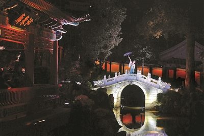 靜心齋與昆曲有著深厚的歷史淵源。明清時(shí)期,昆曲演出就已納入宮廷文化的范疇。在靜心齋西跨院潺潺的流水聲和光影變幻中,游客還將邂逅昆曲《牡丹亭》中最引人入勝的經(jīng)典選段《游園驚夢(mèng)》。亭臺(tái)樓閣,假山疊石,美輪美奐,妙不可言。繼續(xù)往里走,在小玉帶橋上,舞者持傘翩然而舞,以傘遮面,時(shí)而高舉傘,時(shí)而開(kāi)合傘,《雨碎江南》舞蹈讓人看得陶醉。