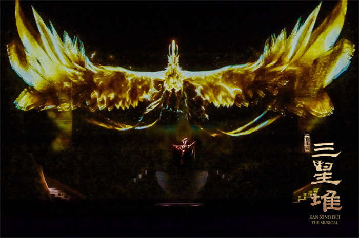 舞美設(shè)計(jì)由倫敦著名設(shè)計(jì)師摩根·拉知(Morgan Large)擔(dān)任,他曾獲2018年英國戲劇獎最佳設(shè)計(jì)獎和4次奧利弗獎、參與過《修女也瘋狂》《周日戀曲》等多部著名劇目舞美設(shè)計(jì)。舞美團(tuán)隊(duì)不僅力圖在色彩和道具上還原三千年前青銅王朝的璀璨與輝煌,還通過兩百余臺電腦燈呈現(xiàn)不同場景的光影效果。觀眾將非常幸運(yùn)地首次在音樂劇舞臺上,一次性看到青銅大立人、青銅大面具、青銅神樹等極具三星堆代表性文物的復(fù)刻版,加上極具沖擊力和感染力的多媒體技術(shù),生動展現(xiàn)了三千年前古蜀國的璀璨與輝煌。