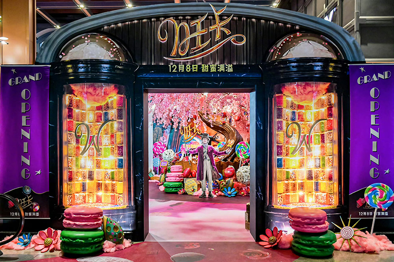 《旺卡》首映禮現(xiàn)場(chǎng)的設(shè)計(jì)獨(dú)具巧思,直接將電影中的旺卡巧克力店“搬到”影城。觀眾手持旺卡巧克力店“開業(yè)”邀請(qǐng)函,穿過大門,就步入旺卡巧克力店,正式開啟繽紛奇趣的童話世界,令人一秒忘記所有煩惱。