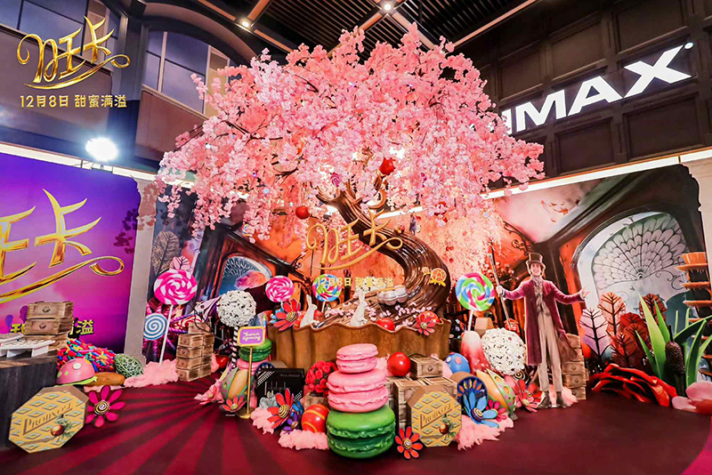 首映現(xiàn)場(chǎng),最引人注目的當(dāng)屬電影里標(biāo)志性的巧克力櫻花樹。片中,旺卡在粉色櫻花樹下漫灑巧克力糖果,夢(mèng)幻爛漫,猶如童話仙境。而在首映禮現(xiàn)場(chǎng),這棵櫻花樹也被完美復(fù)刻,櫻花樹四周堆滿各色巧克力糖果和花朵,令觀眾可以親身走入巧克力“花?!保蔀楫?dāng)天的打卡點(diǎn)。