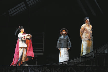 王雷、關(guān)棟天、張頁川分別飾演鄧世昌、丁汝昌、李鴻章(從左至右)。記者 方非 攝