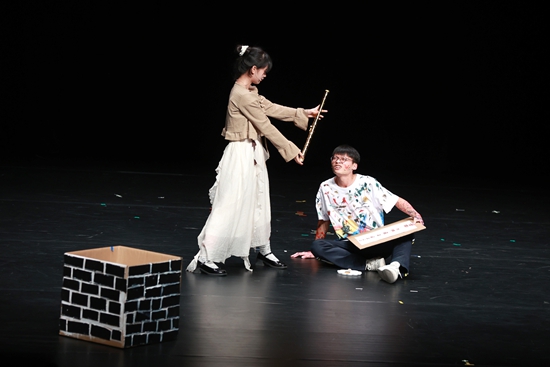 在本屆大賽的主競(jìng)演單元,學(xué)生們需要圍繞首日公布的元素詞,隨機(jī)組隊(duì),開展為期10天的限時(shí)創(chuàng)作,創(chuàng)作出20分鐘的原創(chuàng)劇目。盧昊欣第一次登上這么大的劇場(chǎng),5人小組帶來一部名叫《左右》的戲。
