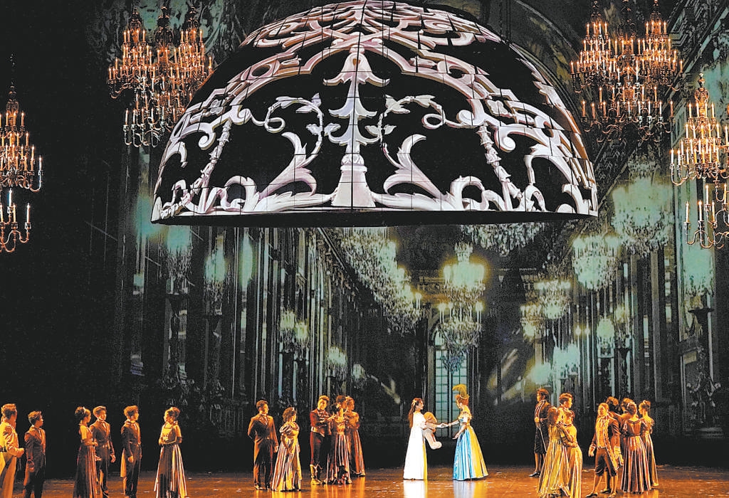 與壯闊宏大的作品立意相匹配的,是當(dāng)?shù)闷鹑A美二字的舞臺(tái)呈現(xiàn)。璀璨的吊燈、長長的樓梯等鮮明意象不斷出現(xiàn),簡潔的布景與流動(dòng)的影像虛實(shí)交織,把輝煌的宮廷、幽靜的鄉(xiāng)村、無垠的星空等場(chǎng)景營造得深邃動(dòng)人。其中,由多塊LED屏拼成的圓弧最引人注目,在舞美設(shè)計(jì)維亞切斯拉夫·奧庫涅夫的解讀中,和平的寧靜短暫降臨時(shí),圓弧可以隨影像變幻為宮殿穹頂、簡潔的花園涼亭,為生活遮風(fēng)擋雨;戰(zhàn)爭襲來,刺目的紅光從破裂崩碎的圓弧中迸濺而出,恰如滿目瘡痍、生靈涂炭的現(xiàn)實(shí)。最終,幾瓣圓弧拼成碧水青山的“地球”,呼應(yīng)原著小說標(biāo)題中的俄語單詞“Mip”,即“世界”,將作品的意境再次推上新的高點(diǎn)。
