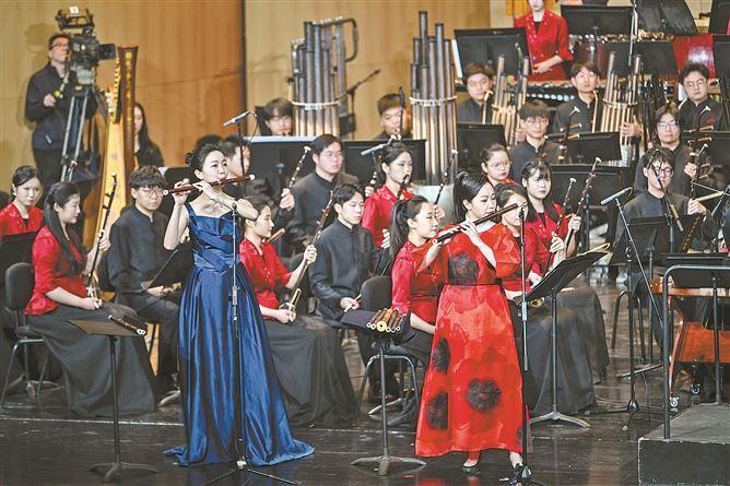 展現(xiàn)“潮”與“年輕態(tài)”的當(dāng)代民樂作品——雙竹笛協(xié)奏曲《熱情與冷漠的邂逅》融入了南音元素。(廈門日報(bào)記者 林銘鴻 攝)