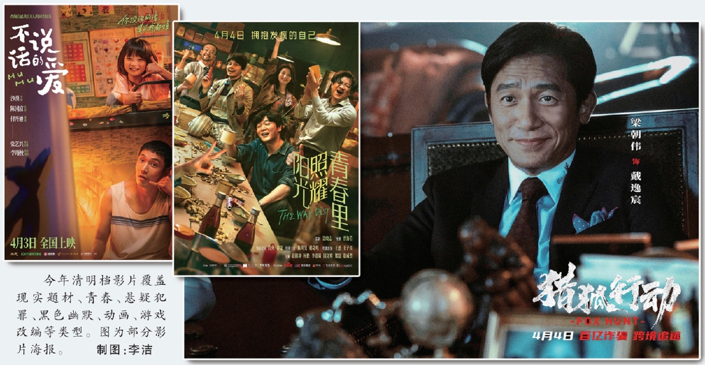 今年清明檔影片覆蓋現(xiàn)實(shí)題材、青春、懸疑犯罪、黑色幽默、動畫、游戲改編等類型。圖為部分影片海報(bào)。 制圖:李潔