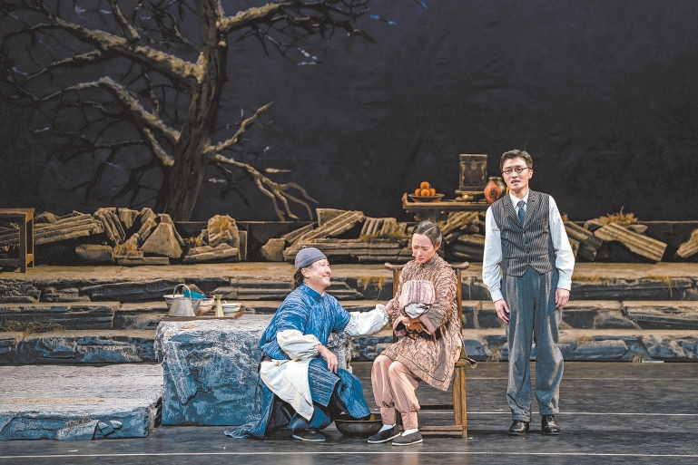 故事中的“煙火氣”則體現(xiàn)在兩處舞臺設(shè)置上:垂下的紗簾幕自由展現(xiàn)出各種城市風(fēng)貌與相關(guān)故事元素;一棵高大的樹立于其中,帶來堅(jiān)硬又孤零的氣息。舞美設(shè)計(jì)李彪說:“北京題材的戲,我繞不開這棵樹,是冥冥之中的感覺?!痹谒恢币詠淼母惺芾?,老舍先生就如這樣一棵樹,“孤獨(dú)……又有生生不息的感覺,雖然是一棵冬天的沒有樹葉的樹,周圍環(huán)境也很寒冷,但樹立在那里,是又孤獨(dú)又溫馨的。”
