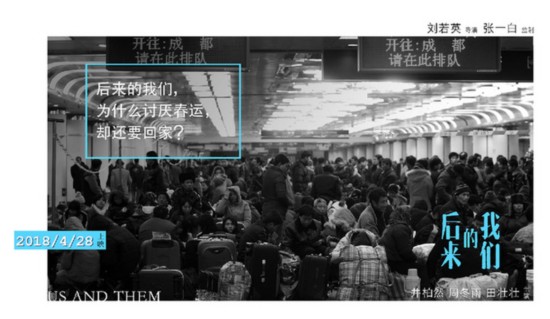在監(jiān)制張一白的助力下,電影不但真實(shí)的還原春運(yùn)的場景,火車更成為男女主人公的初遇邂逅之地。預(yù)告片以周冬雨扮演的小曉在冰天雪地的回家的路上,一聲〝最恨春節(jié)〞的臺詞起始,最后落在男主角井柏然飾演的見清撿起她的車票收尾。期間,在黑白的電影畫面里,漂泊的人們步履匆匆,扛著大包小包匆忙的走向站臺,火車上人頭攢動(dòng),直到周冬雨與井柏然的邂逅讓畫面充滿了色彩。勾起了觀眾對兩位主人公接下來的人生命運(yùn)和情感經(jīng)歷將如何發(fā)展的好奇心。