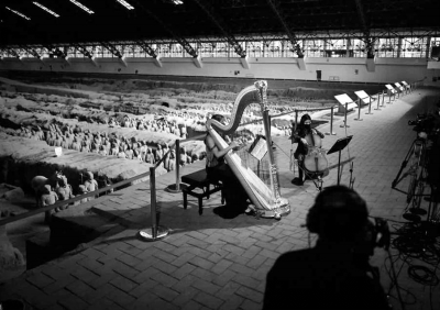 牛背梁最近陰雨連連,樂團必須帶上雨布和雨衣;華山陡峭,得用纜車運送樂器,山頂大風吹得樂譜亂飛,平時在戶外固定譜子的磁條抵擋不住,只能改成橡皮筋這種“土方法”;在秦始皇陵和其他博物館里演出,燈光必須調試到國家規(guī)定的范圍內,聲音也不能超過游客最多時的嘈雜程度,選用的樂器都是柔和的弦樂和木管……