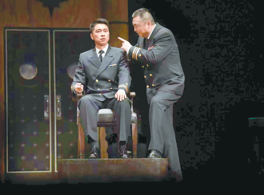 于觀眾而言,戲骨飆戲是《嘩變》格外精彩的看點,無論是制造了“草莓事件”“黃色燃料事件”“電咖啡壺事件”等一系列“鬧劇”的艦長魁格、以“詭計”掌控全場節(jié)奏的律師格林渥,還是圖窮匕見、老謀深算的基弗,抑或每一個各懷目的、性格鮮明的角色,他們之間起伏有致的銜接是對演員表演功底的極大考驗。飾演魁格的馮遠征把《嘩變》總結為一場“坐著把戲演好”的挑戰(zhàn),全劇除了格林渥與檢察官可以走動,其他所有人幾乎坐著演完全程,如何把臺詞說得詳細、說得抓人,同時靠說就把角色塑造到位,是演員需要日日精進的功課,也是觀眾愿意一再為之奔赴而來的重要理由。