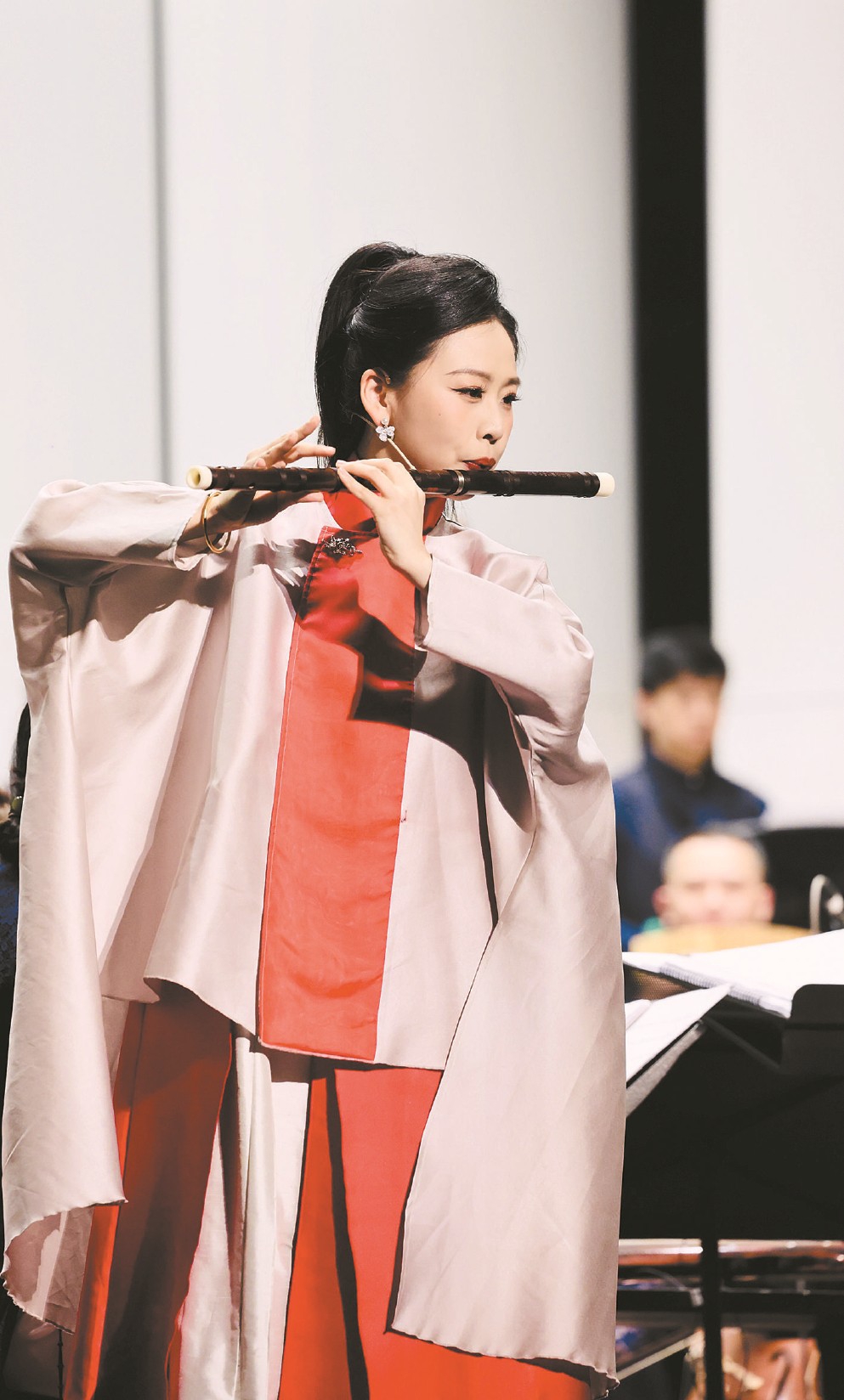 29歲的笛簫演奏家王澤上演李博禪作曲的《云水三章》。這首誕生于2023年的新作分為“向天邊的云”“向水中的葉”“向遠方的人”三部分,展現(xiàn)了曲笛、梆笛、新笛和簫的不同技巧和音樂特色,表達不同的人生意境。28歲的高雅演奏的是郭文景作曲的《愁空山》,這部作品被譽為竹笛界“最具演奏難度的曲目之一”。高雅迎難而上,不僅傳達了作品雄渾、厚重的精神內(nèi)核,又呈現(xiàn)出細膩感和層次感。