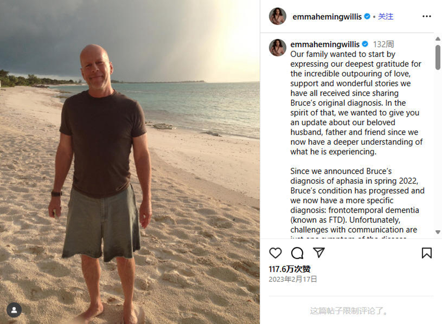 2022年,布魯斯·威利斯的家人發(fā)布聯(lián)合聲明,宣布他將退出演藝事業(yè)。因為他被診斷患上失語癥,這影響了他的認(rèn)知能力和溝通能力。一年后,家人再次發(fā)文透露,他的病情進(jìn)一步發(fā)展,且有了更具體的診斷結(jié)果:額顳葉癡呆(FTD)。