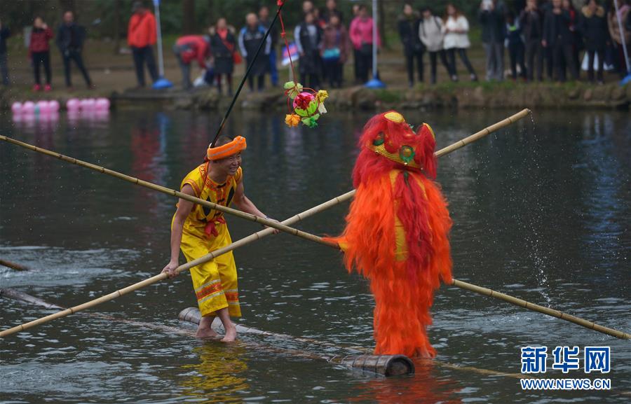 1月1日,“獨(dú)竹漂”愛好者在花溪河上表演水上高難度平衡動作。 2016年元旦,在貴陽市花溪公園平橋河段舉行的貴陽市第31屆冬泳表演活動中,數(shù)十名“獨(dú)竹漂”愛好者在花溪河上腳踏漂浮的竹竿,表演“金雞獨(dú)立”、轉(zhuǎn)身平衡等高難度動作,讓觀眾大飽眼福。新華社發(fā)(秦剛 攝)