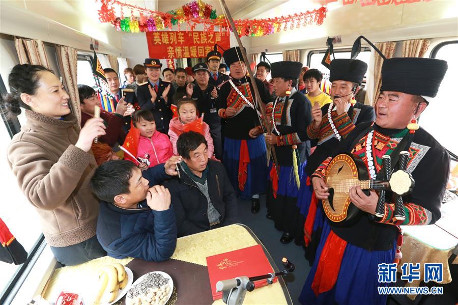 2月1日,彝族藝術(shù)家在K165次列車上為旅客表演。當(dāng)日,在西安鐵路局西安至昆明的K165次列車上,四川美姑縣原生態(tài)畢摩樂(lè)隊(duì)與西安客運(yùn)段職工民樂(lè)小分隊(duì)聯(lián)合舉辦“英雄列車民族之聲親情溫暖回家路”音樂(lè)會(huì),畢摩樂(lè)隊(duì)用口弦、哈門、木葉、瑪布等彝族民間樂(lè)器演奏的音樂(lè)為返鄉(xiāng)過(guò)年的旅客提前送上新年祝福。民間藝術(shù)家和列車乘務(wù)員還為旅客們送上“?!弊?、春聯(lián)。新華社發(fā)