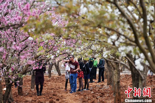 3月22日,昆明萬溪沖村萬畝梨花盛開,吸引了許多市民前來賞花拍照。中新社記者 任東 攝
