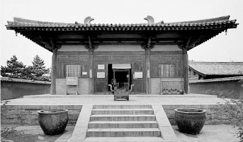 南禪寺位于山西五臺(tái)縣城西南22公里李家莊西側(cè)。坐北向南,有山門、龍王殿、菩薩殿和大佛殿等主要建筑,圍成一個(gè)四合院形式。創(chuàng)建年代不詳,大殿平梁下保存有墨書(shū)題記,足證重建于唐建中三年(782)。晚唐時(shí)武宗“會(huì)昌滅法”幸免毀壞,是我國(guó)現(xiàn)存最古的唐代木構(gòu)建筑。大殿面寬進(jìn)深各三間,單檐歇山式屋頂,殿前有寬敞的月臺(tái),柱上安有雄健的斗拱,承托屋檐,殿內(nèi)無(wú)柱,四椽桴通達(dá)前后檐柱之外,梁架結(jié)構(gòu)簡(jiǎn)練,屋頂舉折平緩。說(shuō)明我國(guó)唐代建筑技術(shù)已有很高水平,而且已普及到偏僻山村。