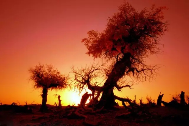 胡楊林是塔里木河流域典型的荒漠森林草甸植被類型,從上游河谷到下游河床均有分布。雖然胡楊林結(jié)構(gòu)相對(duì)簡(jiǎn)單,但具有很強(qiáng)的地帶性生態(tài)烙印。無論是朝霞映染,還是身披夕陽,它在給人以神秘感的同時(shí),也讓人解讀到生機(jī)與希望。據(jù)有關(guān)資料顯示,人們還夸贊胡楊巨大的生命力是“三個(gè)一千年”,即活著一千年不死,死后一千年不倒,倒后一千年不朽。