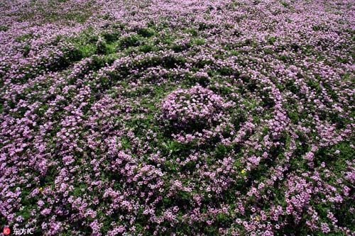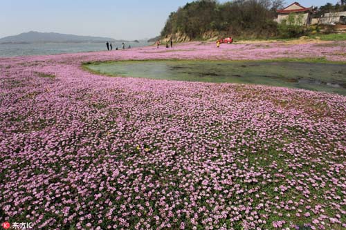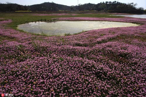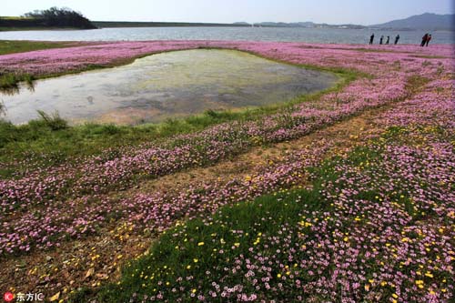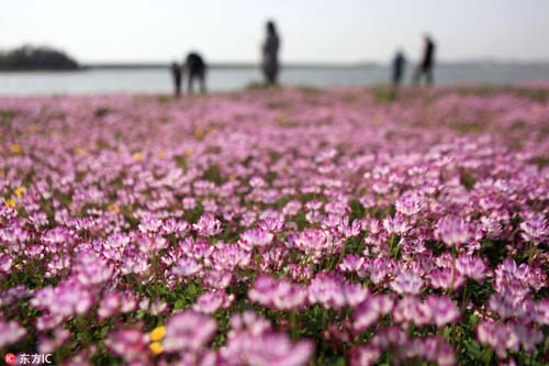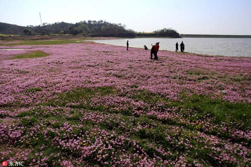 2017年3月26日,在我國最大淡水湖鄱陽湖畔,紫云英等盡情綻放。藍天白云,青山碧水,紅花綠草構(gòu)成的醉美春色,吸引不少游客觀賞拍攝。