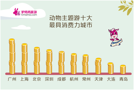 哪些地方的游客在動物主題游上最舍得花錢?數(shù)據(jù)顯示,動物主題游消費總額前10的出發(fā)地城市分別為:廣州、上海、北京、深圳、成都、杭州、南京、天津、大連、青島。
