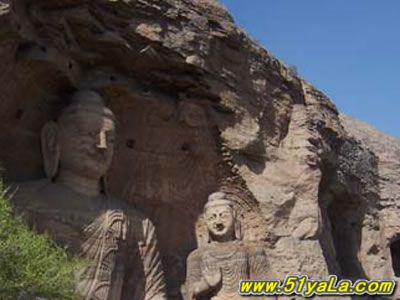 云岡石窟位于山西省大同市以西16公里處的武周山南麓。石窟始鑿于北魏興安二年(公元453年),大部分完成于北魏遷都洛陽之前(公元494年),造像工程則一直延續(xù)到正光年間(公元520~525年)。石窟依山而鑿,東西綿亙約1公里,氣勢恢弘,內(nèi)容豐富?,F(xiàn)存主要洞窟45個,大小窟龕252個,石雕造像51000余軀,最大者達(dá)17米,最小者僅幾厘米??咧衅兴_、力士、飛天形象生動活潑,塔柱上的雕刻精致細(xì)膩,上承秦漢(公元前221年~公元220年)現(xiàn)實主義藝術(shù)的精華,下開隋唐(公元581~907年)浪漫主義色彩之先河,是世界聞名的石雕藝術(shù)寶庫之一。1961年國務(wù)院公布為全國重點文物保護(hù)單位,2001年被列為世界文化遺產(chǎn)。