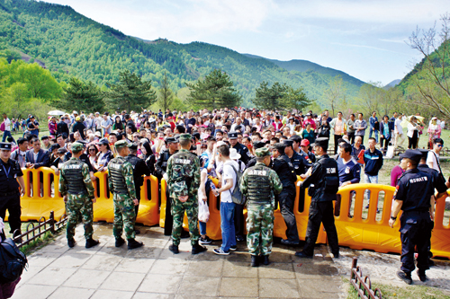 5月18日深夜,隨著三個入山口人流的驟增,原定22時30分上崗的民警提前到20時全部到位。23時40分,記者來到南線游客中心,只見潮水般的人群涌向售票大廳,不少公安民警在安監(jiān)門口嚴(yán)密把守,有序放行,站在臺階上的民警手舉超大口徑的大喇叭向嘈雜擁擠的人海不斷地呼喊:“不要擁擠,有序排隊!”在游客中心東邊的交通要道上,全副武裝的交通民警正在緊張地疏導(dǎo)川流不息的車輛。19日1時燈光下,記者看到擔(dān)任此次安保總指揮的市公安局局長楊梅喜在寒風(fēng)中與民警一道指揮交通。