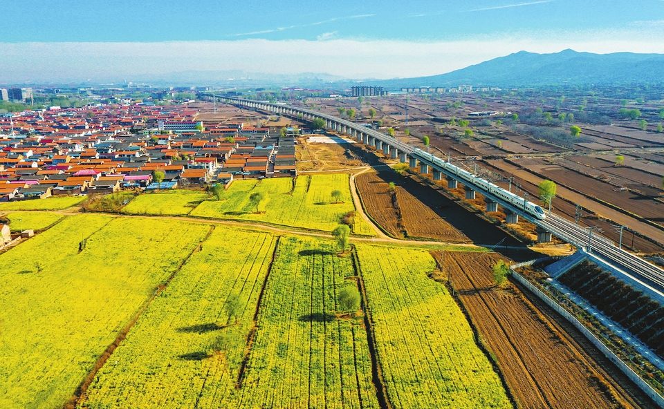 4月9日,長(zhǎng)治市潞州區(qū)南垂村,金燦燦的油菜花海與村落、高鐵列車交織成一幅鄉(xiāng)村振興的田園畫卷,美不勝收。張海 張永清攝
