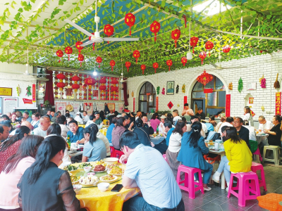 “上午游覽完太行洪谷和紅色體驗(yàn)基地,中午專(zhuān)程慕名到他家吃銅火鍋。你看這兒,吃火鍋連風(fēng)扇都不用開(kāi),而且食材地道,味道正宗,吃著過(guò)癮。”帶全家來(lái)南陽(yáng)村游玩的晉城市民趙先生一邊大快朵頤,一邊美滋滋地說(shuō)。